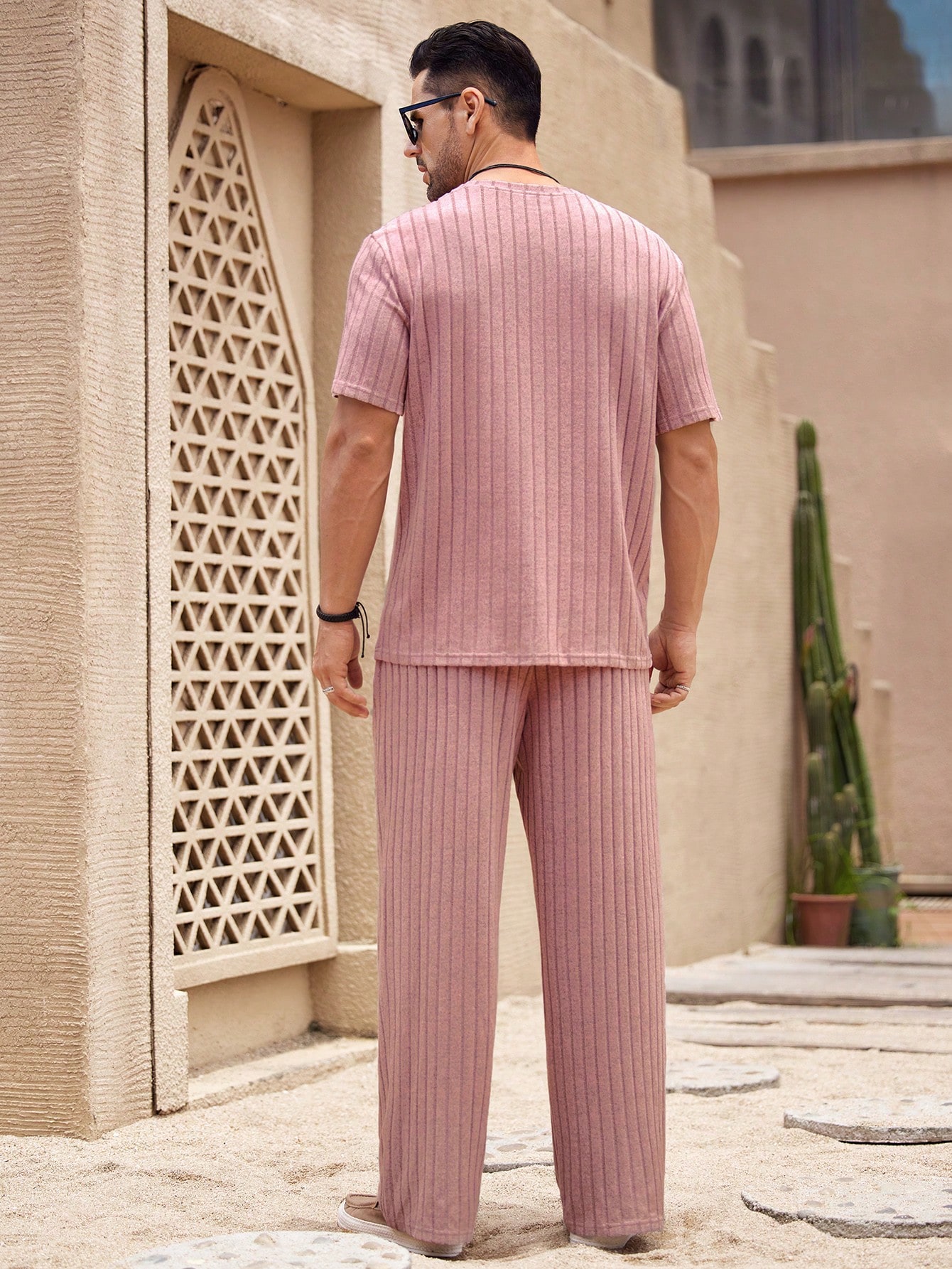 Manfinity KASUA 2pcs/Set Men??s Notched Neck Short Sleeve T-Shirt And Straight-Leg Casual Pants Outfit