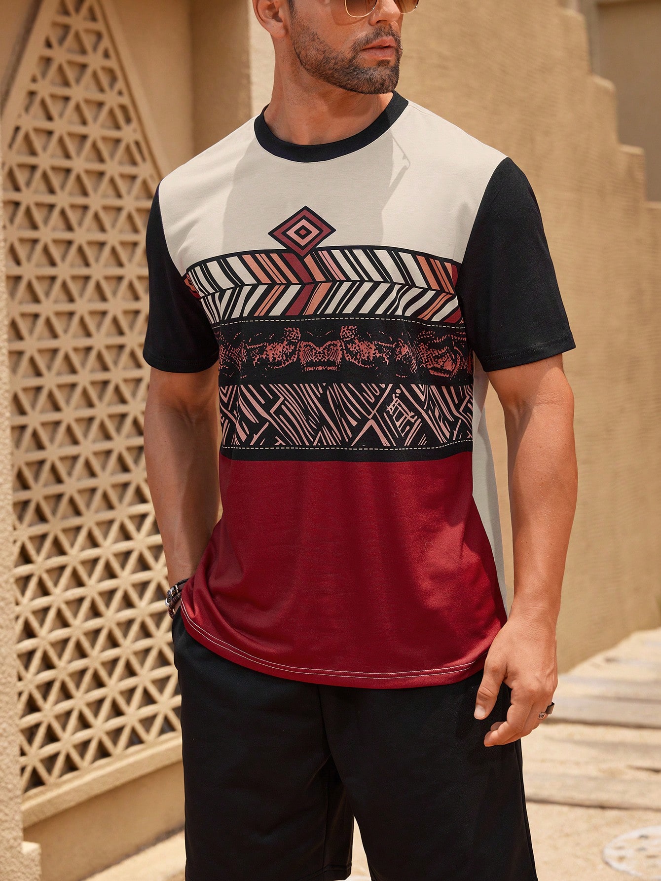Manfinity KASUA Men??s Short Sleeve Round Neck Tee With Geometric Print, Summer