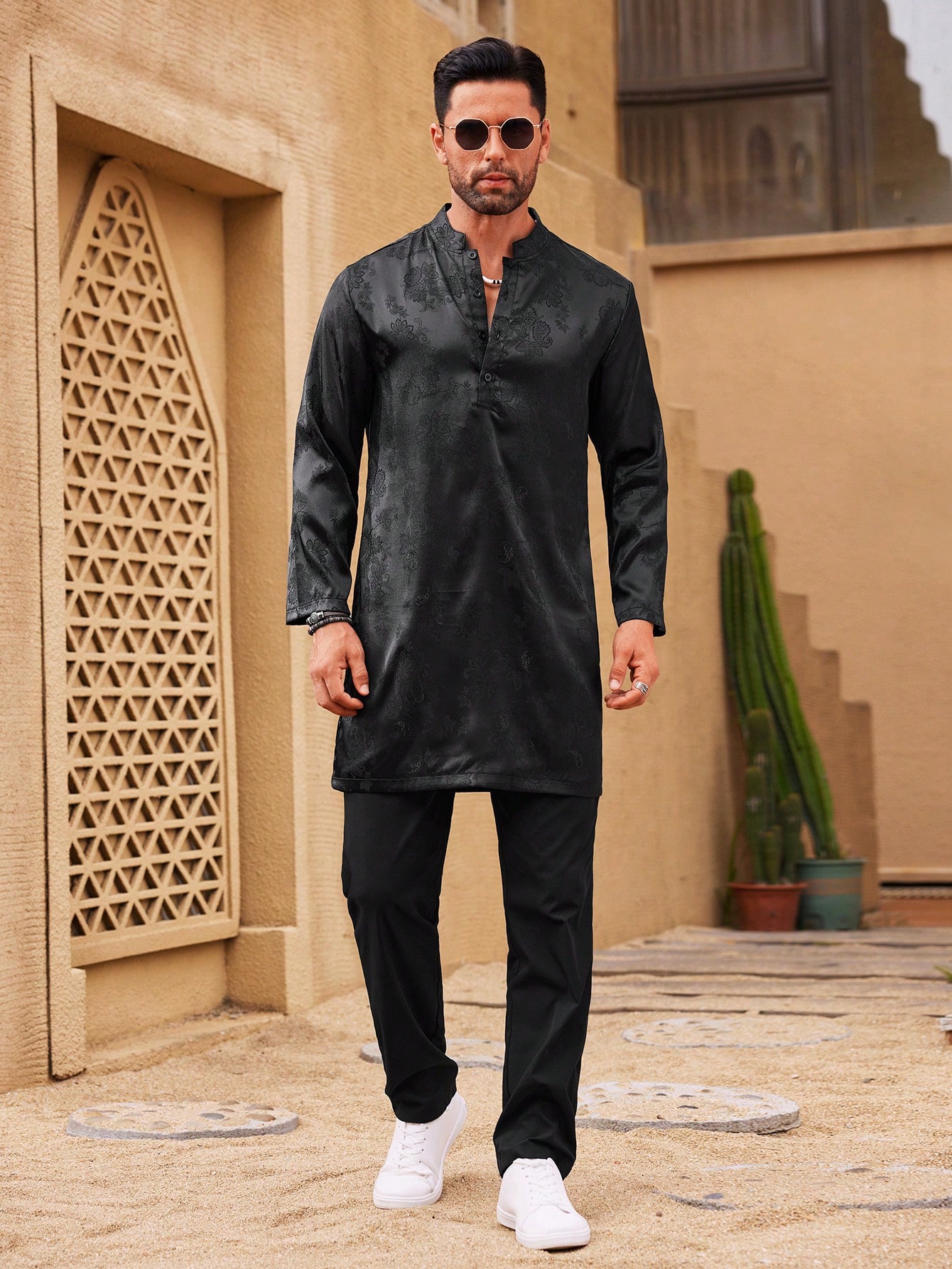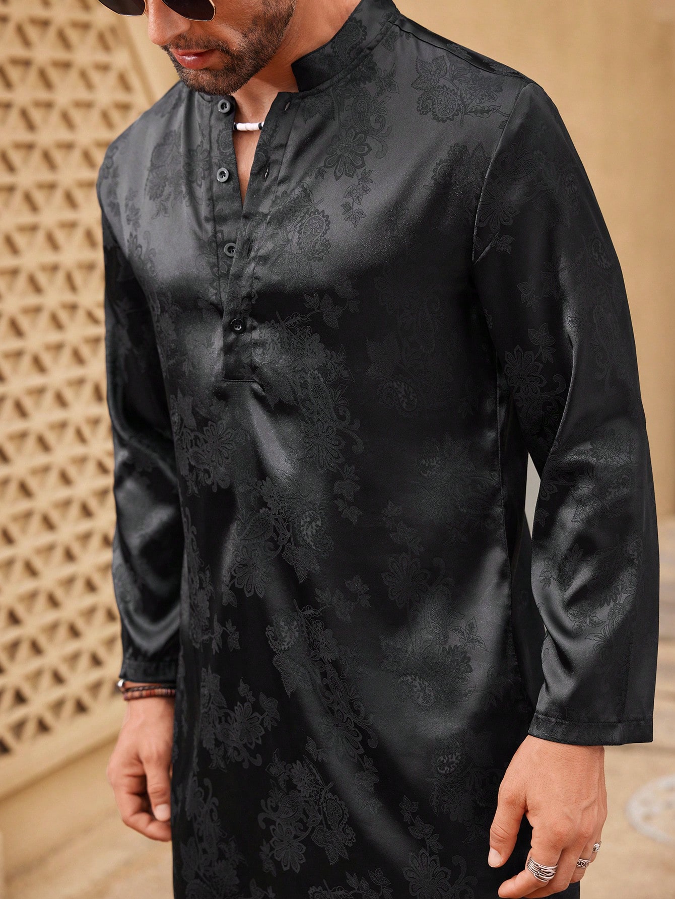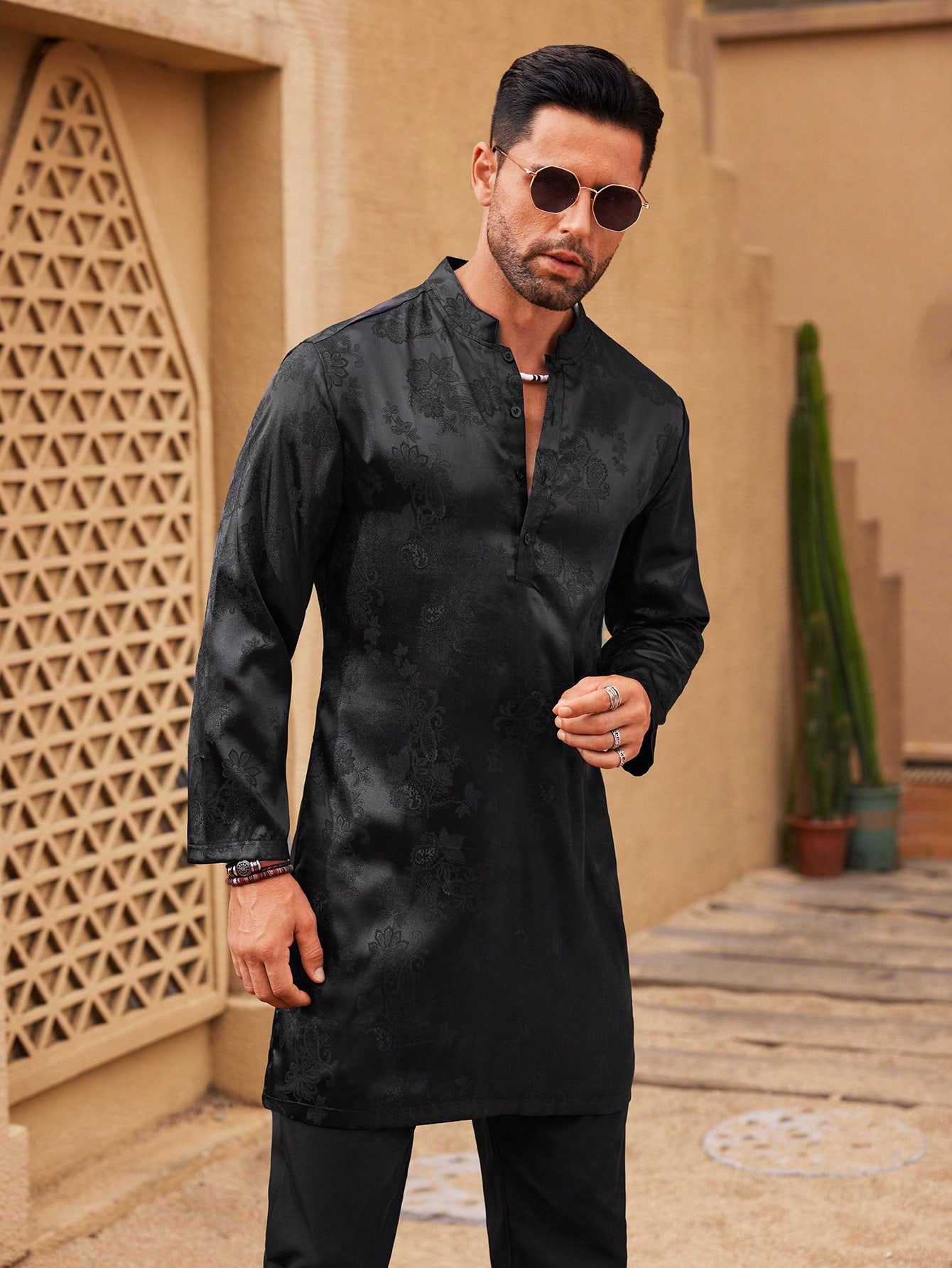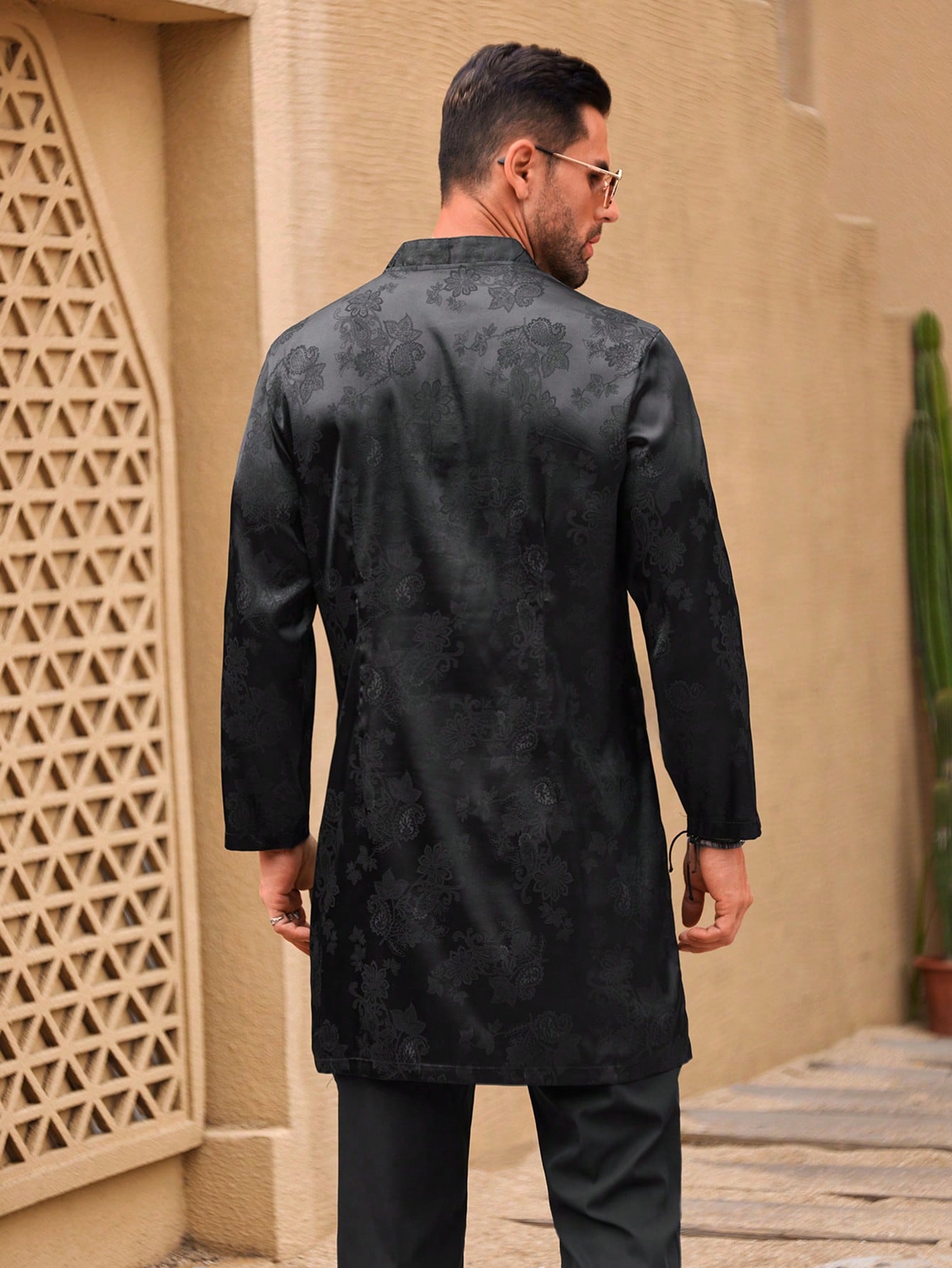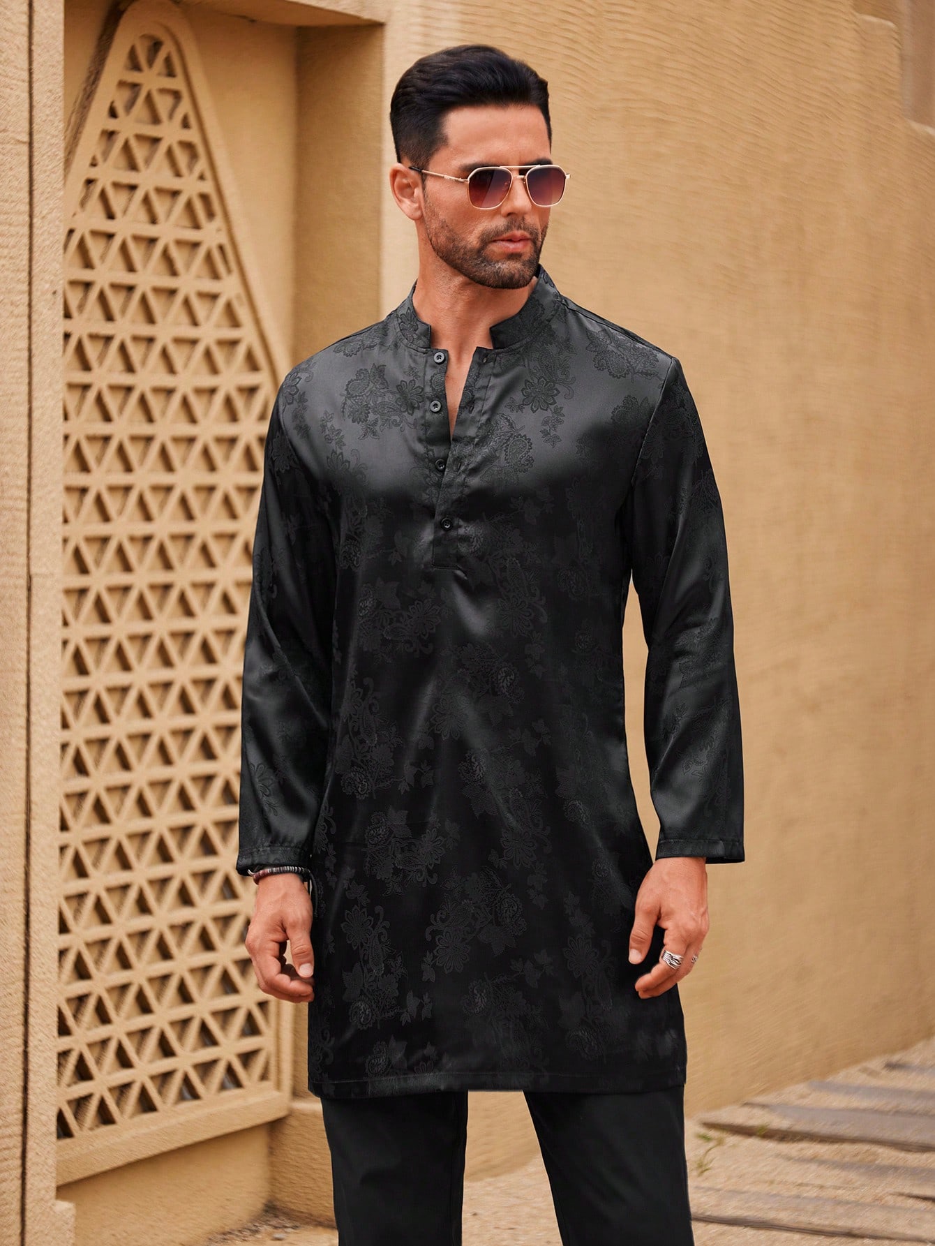 Manfinity KASUA Men??s Spring/Summer Floral Jacquard Button-Up Shirt With Half Placket And Long Sleeves