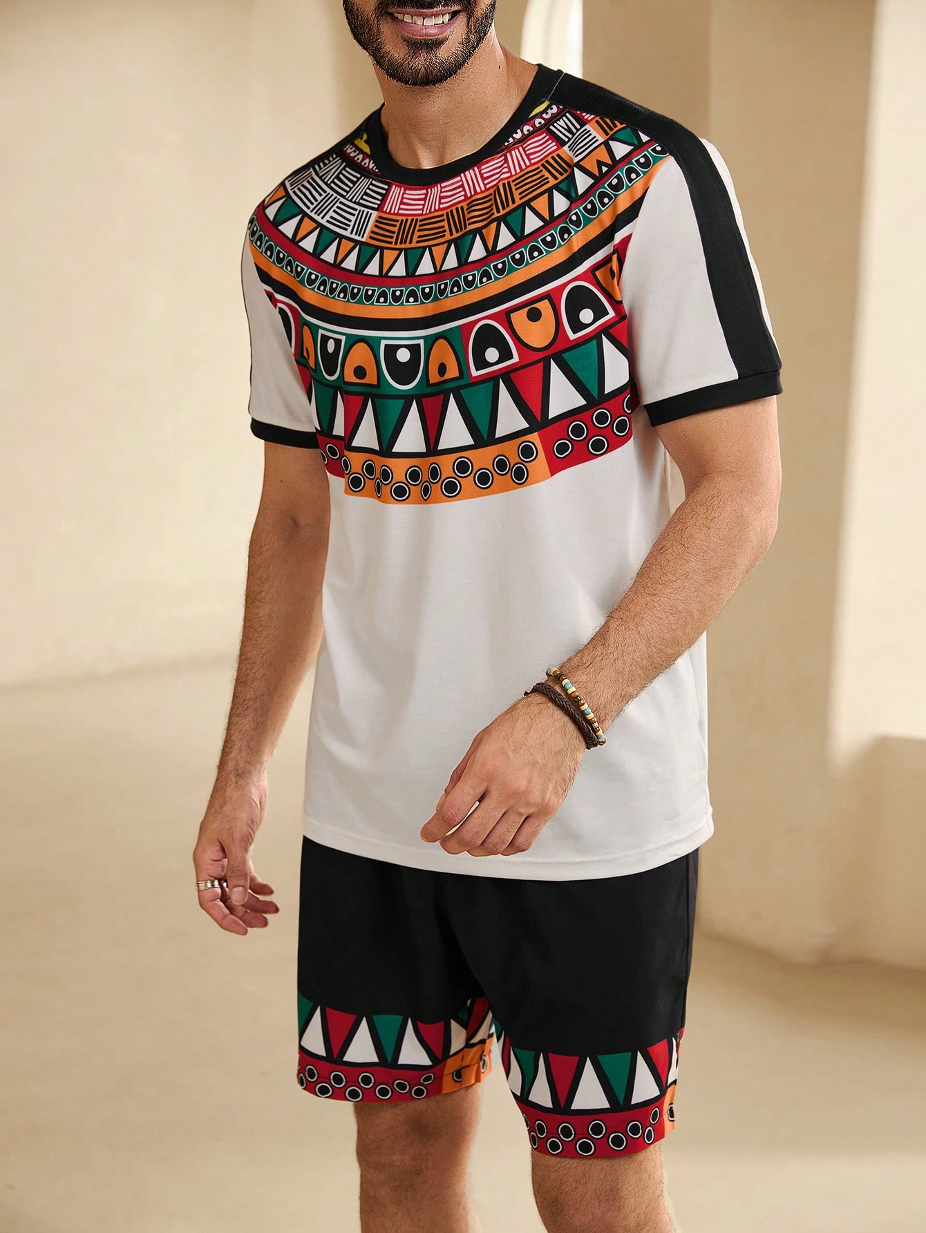 Manfinity KASUA Men??s Summer Geometric Print Round Neck Short Sleeve Casual T-Shirt And Drawstring Waist Shorts Set